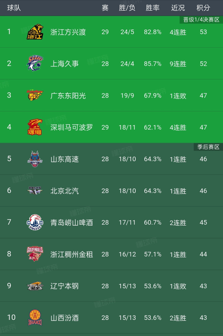 深圳升向前四,CBA劲旅山东则是暂时跌出前四。