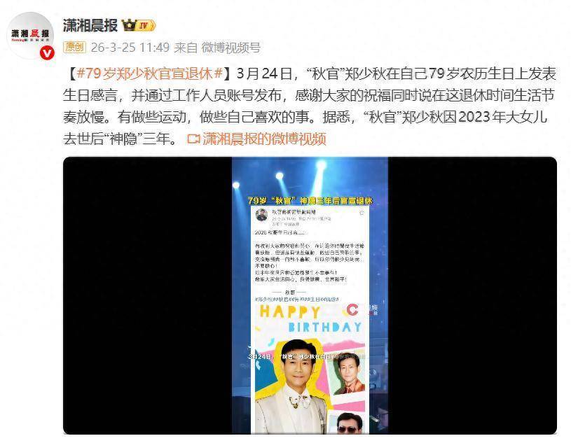 据@潇湘晨报,79岁郑少秋官宣退休。3月24日,“秋官”郑少秋在我方79岁农历诞辰上发表诞辰感言,并通过责任主说念主员账号发布,感谢世界的祝愿同期说在这退休时间生活节律减速。有作念些开放,作念些我方可爱的事。