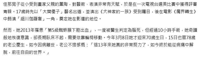 2013年,她突发蛛网膜下腔出血,一度被判定为脑示寂;古迹苏醒后,却永恒丧失举止智力,在轮椅上坚捏活命整整13年。