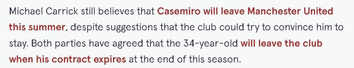卡里克在赛后承认,卡塞米罗的情状使他成为刻下球队不成或缺的一员。仅仅固然有传言称曼联可能会试图遮挽卡塞米罗,卡里克仍然认为巴西中场今夏会离开,他在合同时满后开脱转会,仍是通过俱乐部进行了官宣。